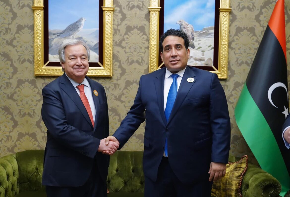 ناقش رئيس المجلس الرئاسي محمد المنفي مع الأمين العام للأمم المتحدة، أنطونيو غوتيريش، مساء الخميس تطورات الأوضاع السياسية في ليبيا والسُبل الكفيلة للدفع قدماً بالمسار السياسي.